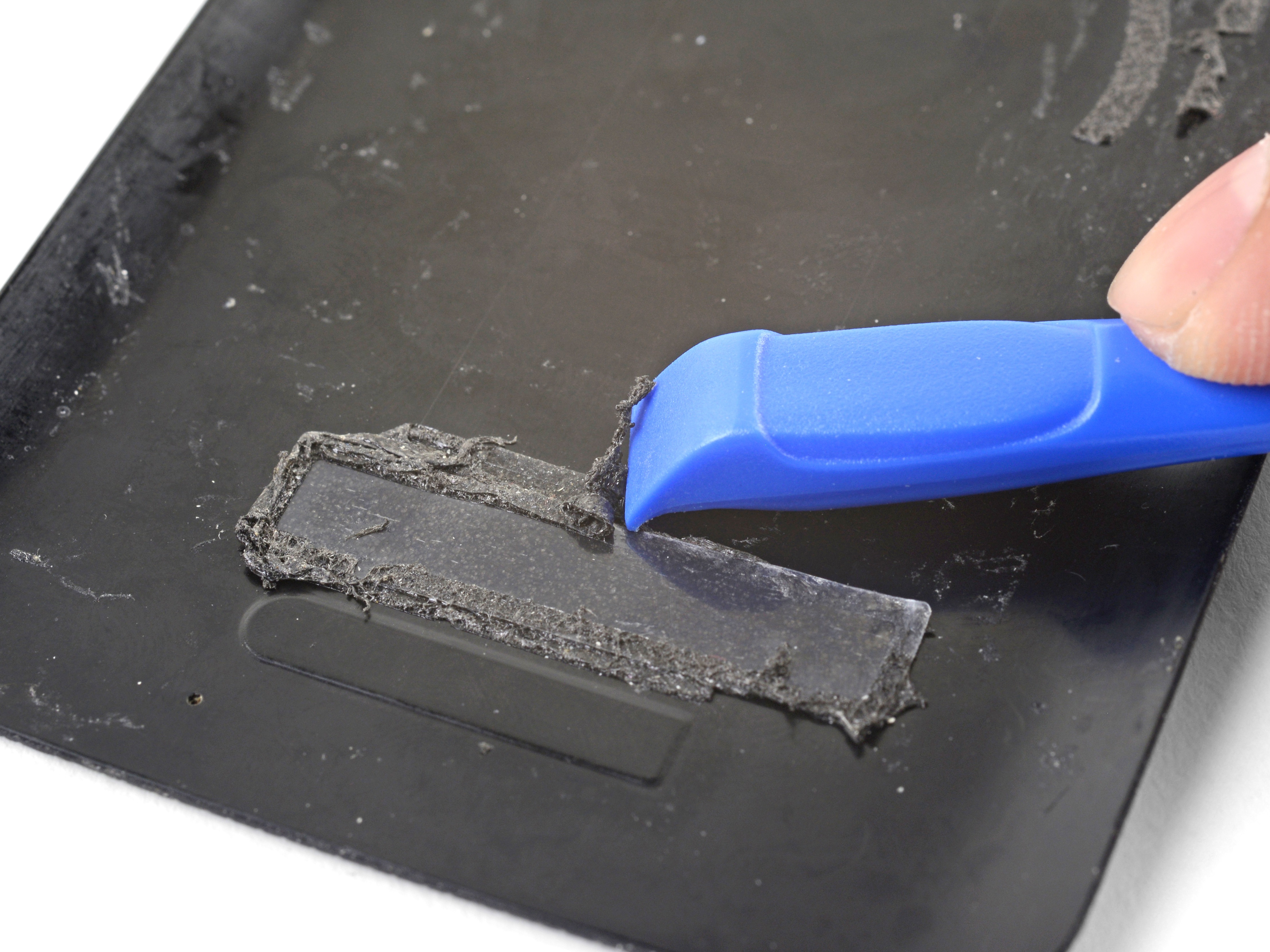 - Use tweezers to pull adhesive chunks off. Use the opening tool to scrape residue off. You can use high concentration (over 90%) isopropyl alcohol to help dissolve residue.