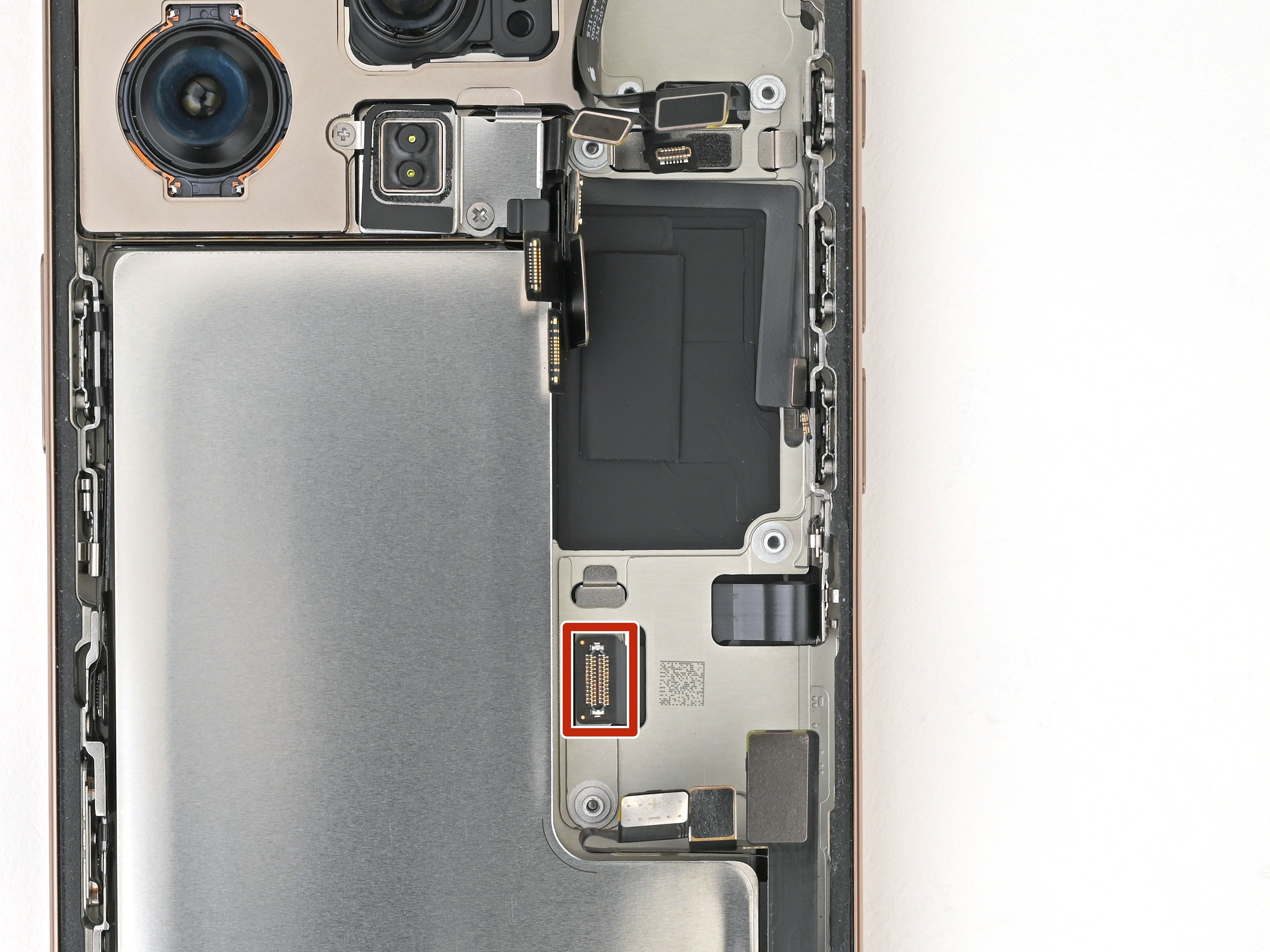 - Use your finger or a spudger to connect the earpiece speaker and 5G mmWave antenna (US only) press connectors, located on the top right corner of the logic board.